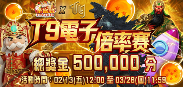 T9電子遊戲限定倍率賽,總獎金 50 萬分,活動期間內達成條件即可競逐獎勵。